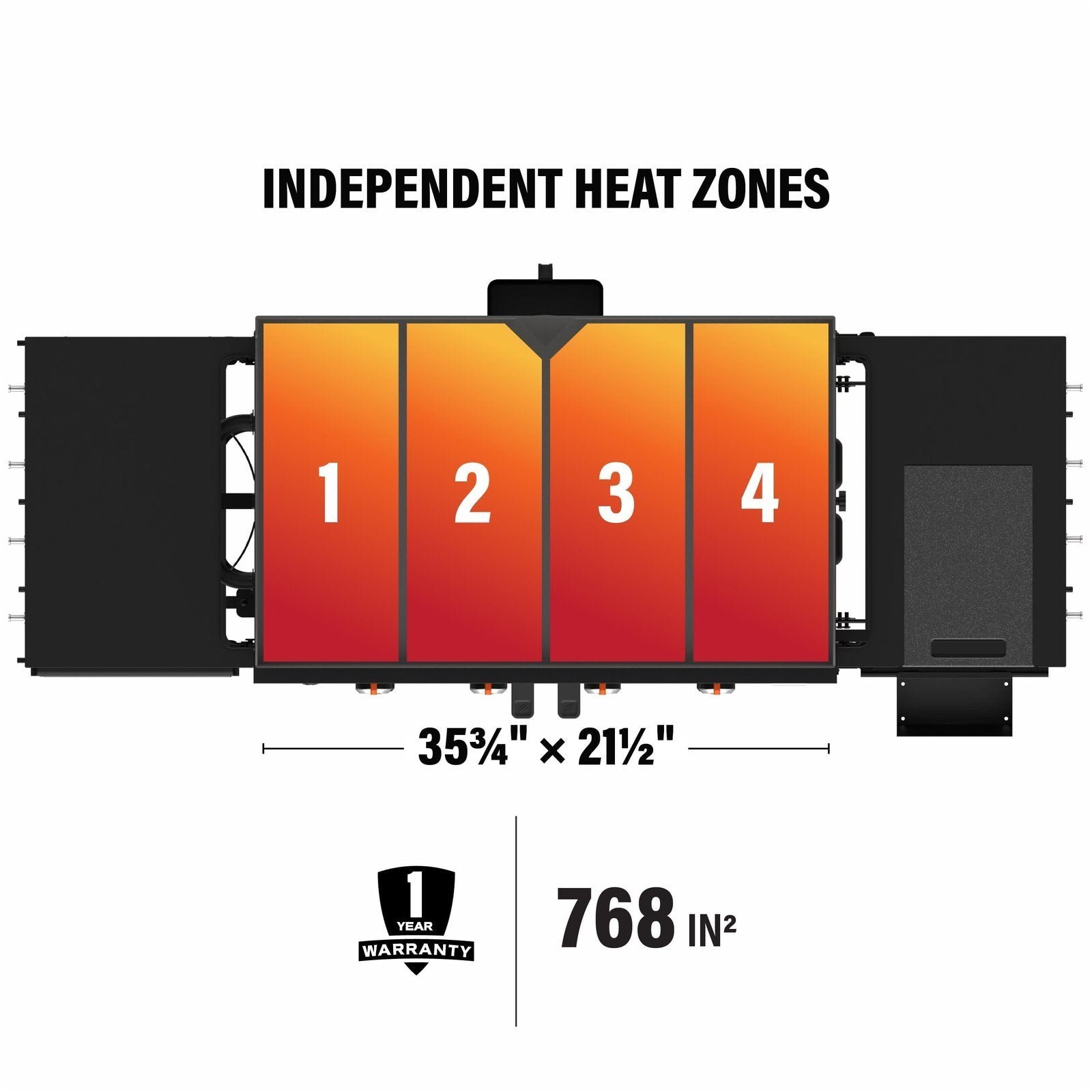 Create delicious outdoor meals on this Blackstone 36” Omnivore Griddle with Hood and Folding Side Shelves. This griddle was designed to make cooking outdoors easier and more efficient. The Omnivore Griddle Plate provides faster preheat and recovery times, more even heating across the griddle top, and less fuel use per cook. With 768 square inches of cooking space and four independently controlled burners, this flat top grill is great for making multiple food items at once. Extra features including a side shelf cutting board, magnetic tool strip, bottle opener, and paper towel holder make it easier to prep, cook, and clean up. Protect your griddle top with the integrated ‘X’ brace hood and fold down the side shelves after use for more compact storage. Enjoy everything from prepping your meal to cleaning up after it when you make your meals on this Blackstone 36” Omnivore Griddle.