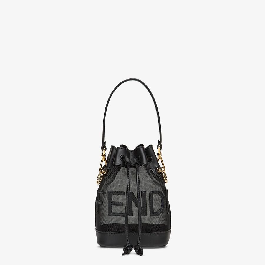 Mini Mon Tresor bucket bag made of beige mesh and featuring Fendi lettering and a white leather trim.