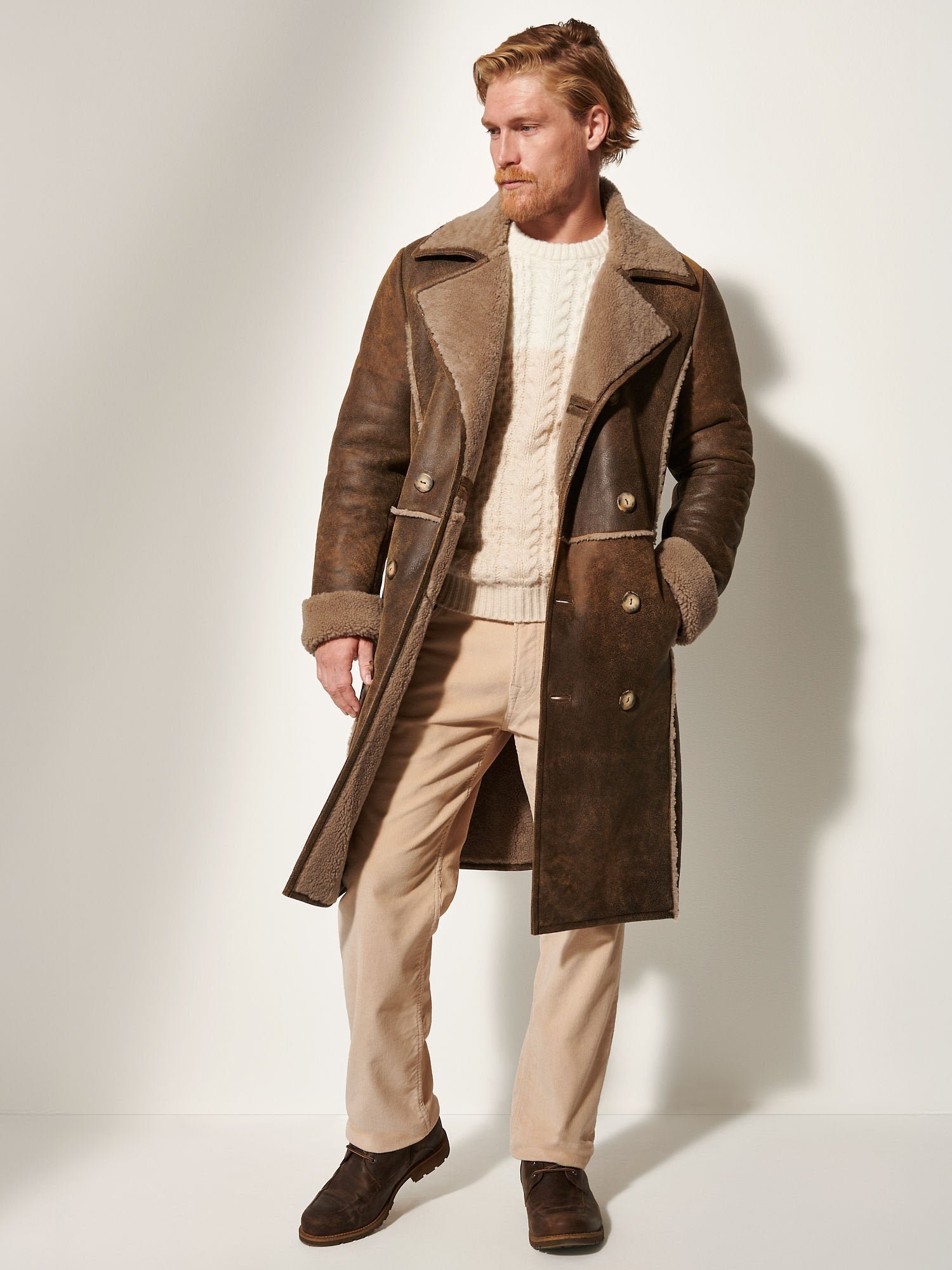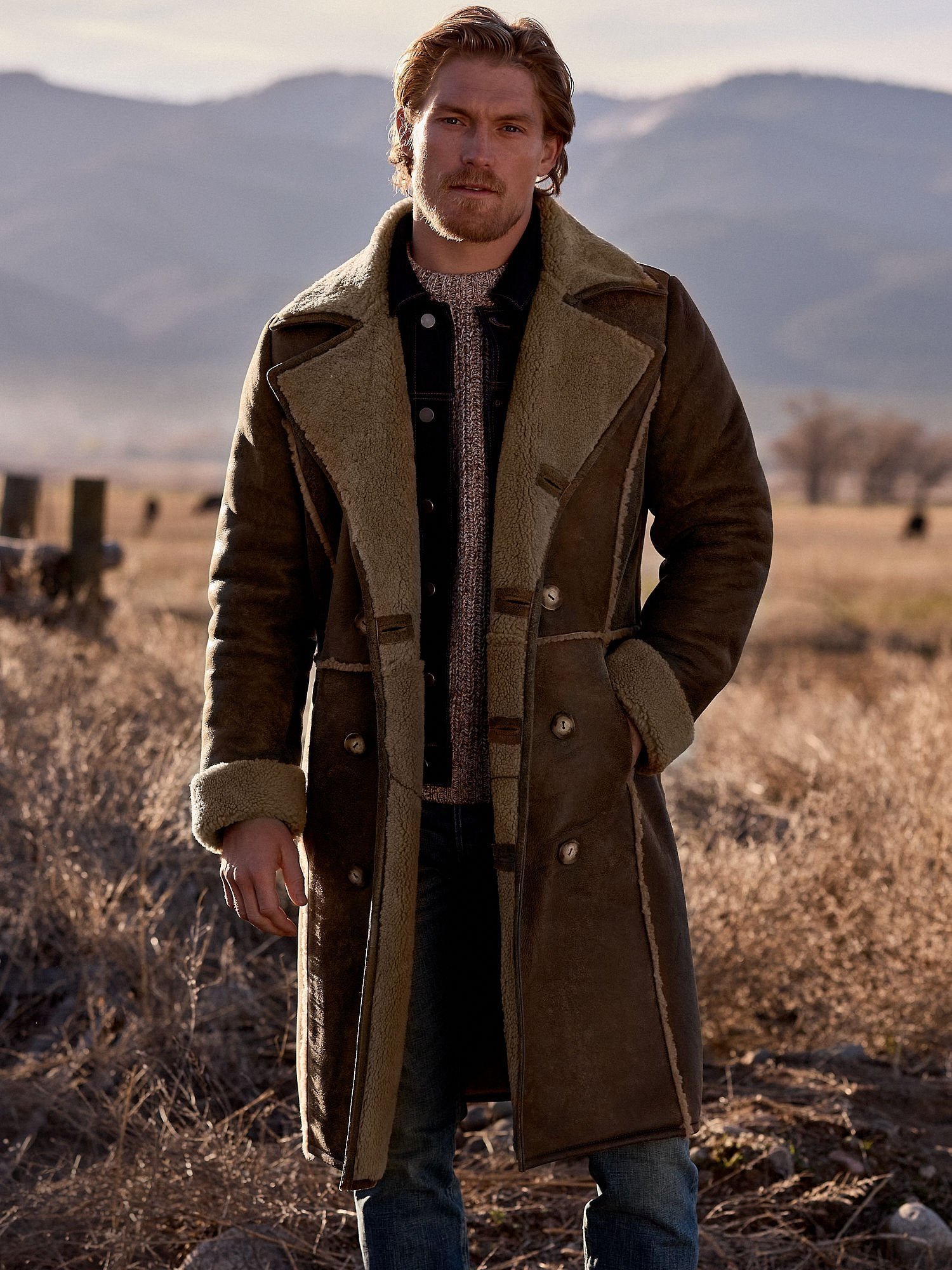 Designed for maximum coverage, the Highlander sheepskin coat is a prime example of fine tailoring and skilled craftsmanship. Its handsome, double-breasted construction, generous notch collar, shearling-out seam lines, and extra length are based on archival designs. A striking presence, this rich shearling coat will reliably shield you from whatever bitter cold you may encounter, whether in the scenic outdoors or under the skyline of a bustling city.