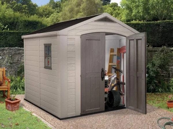The Keter Factor Shed 8 x 8ft is a UV stabilised double door storage building that is deep enough for bikes, high enough for ladders, and features 2 wide doors for easy access.