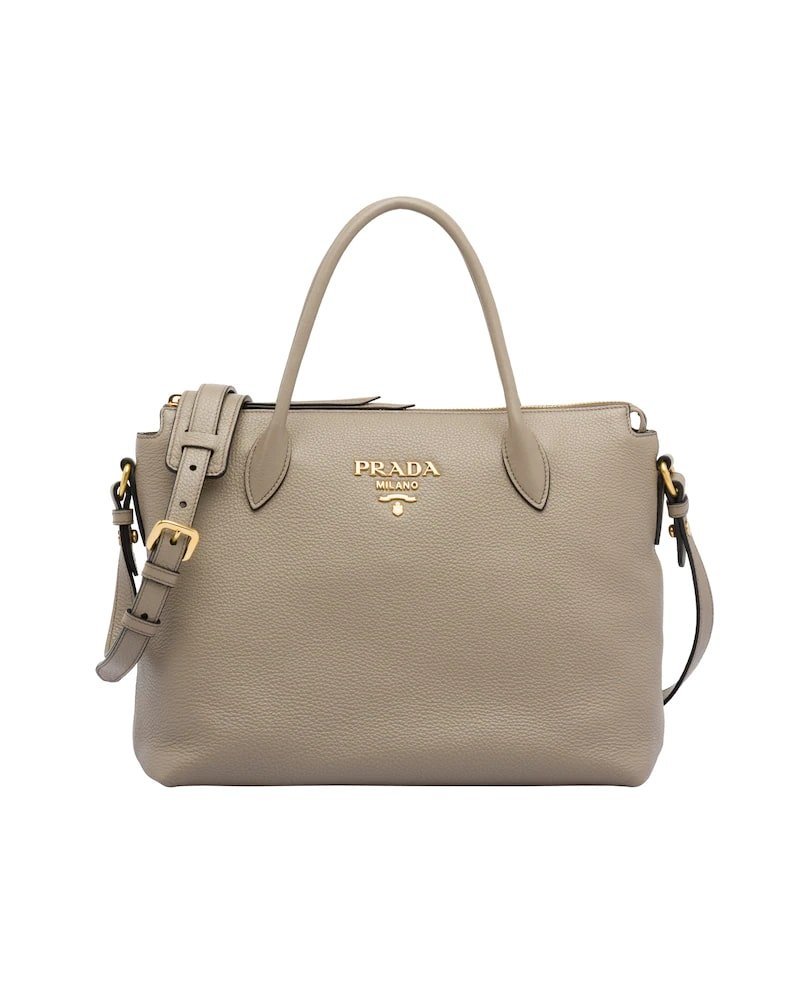 This leather bag with double shoulder strap is decorated with the Prada metal logo.