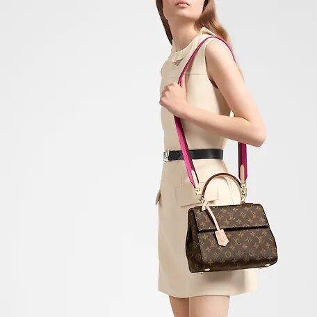 A colorful leather strap lends a lively twist to this Cluny BB handbag, crafted from classic Monogram canvas. Worn cross-body or carried in ladylike fashion by its top handle, this timeless bag is designed for busy lifestyles. It opens wide for easy access to the smartly organized interior, while the magnetic flap and zipped inner pocket keep belongings secure.