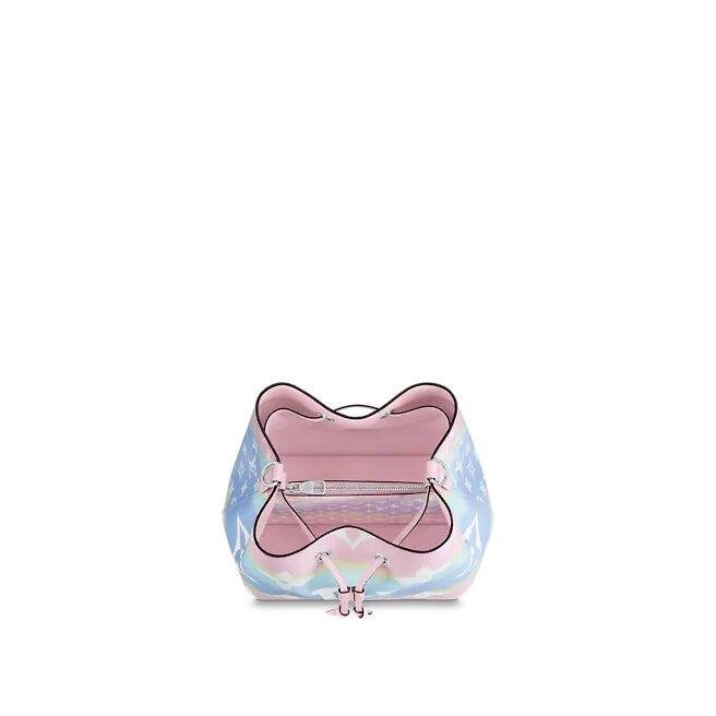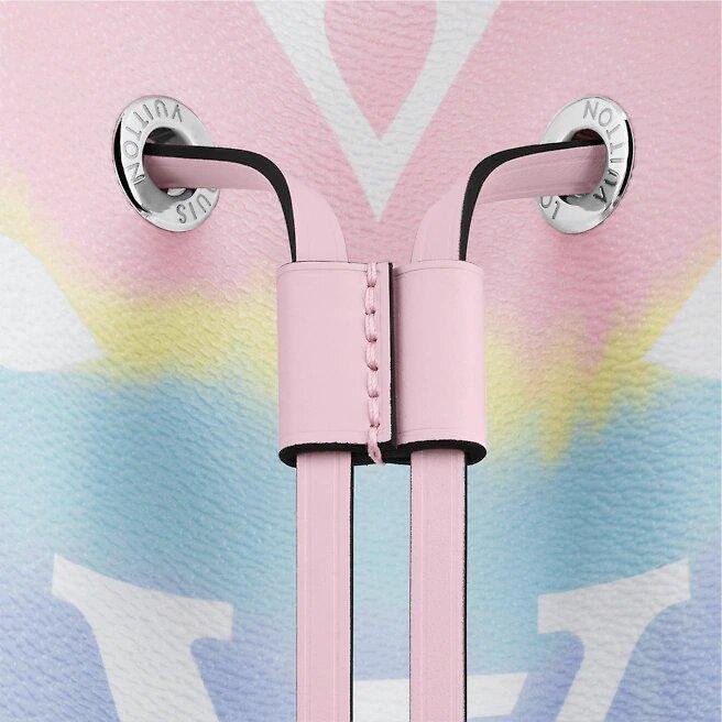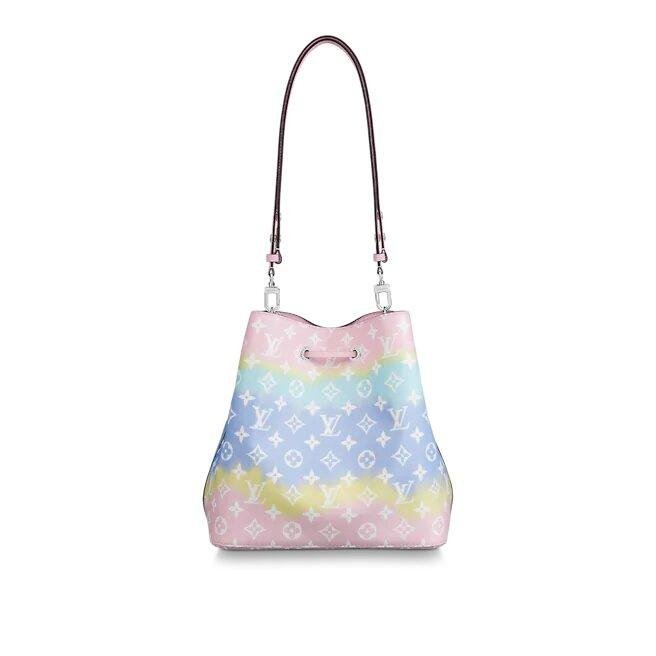 The NéoNoé bucket bag is available in Tie-Dye Monogram canvas for the L.V Escale Collection. Present across L.V purses, shoes and ready-to-wear this season, this sudden motif is inspired by the Japanese Shibori approach of knotting fabric before dyeing it. A light-weight bag, with a removable strap for a shoulder or pass-frame convey.
