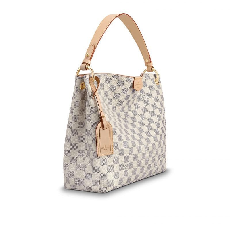 The Graceful PM hobo in fresh Damier Azur canvas is a lightweight, roomy bag to carry every day. Natural cowhide leather detailing and golden hardware adds a refined touch. The body-friendly design combines with a supple, flat handle for stylish and comfortable over-the-shoulder wear. The magnetic closure and zipped inside pocket keep belongings secure.