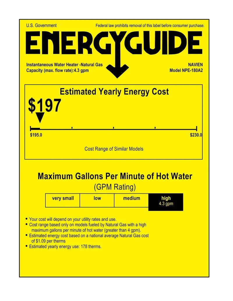 The NPE-180A2 is a high efficiency tankless unit with 150,000 BTU/hr that can provide and endless supply of hot water. The 180A2 has a flow rate of 6.5 GPM at a 45 degree temperature rise and is equipped with built in recirculating technology. Navien units are efficient and reliable making them a fantastic choice as an upgrade for all your hot water needs.