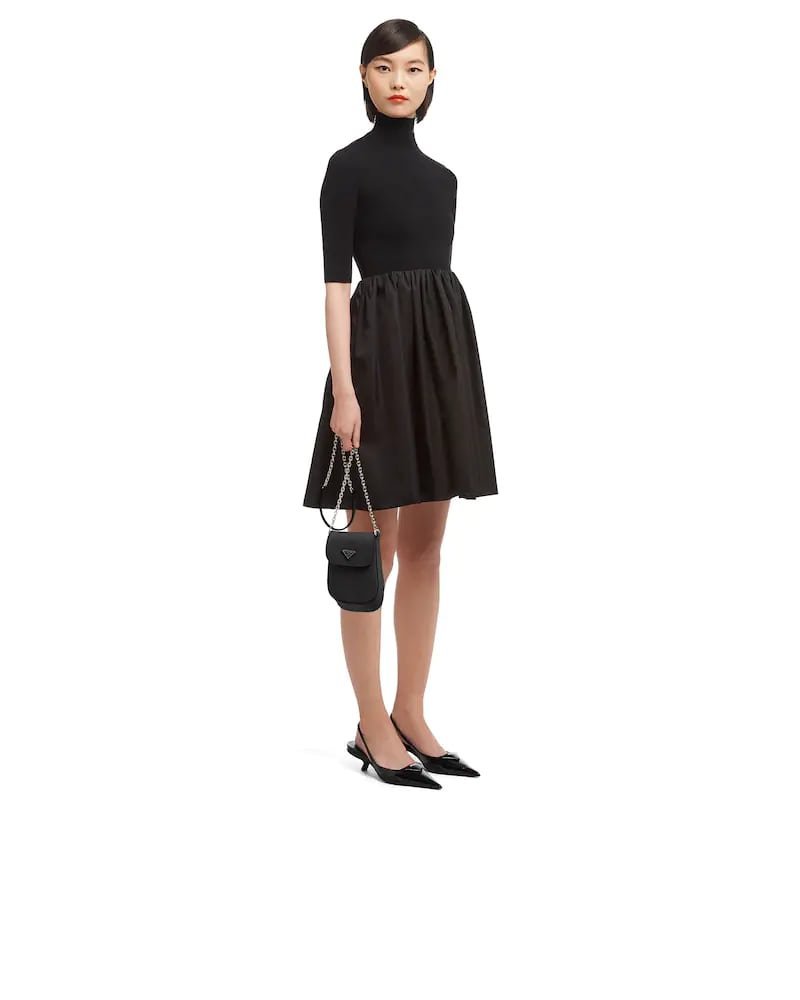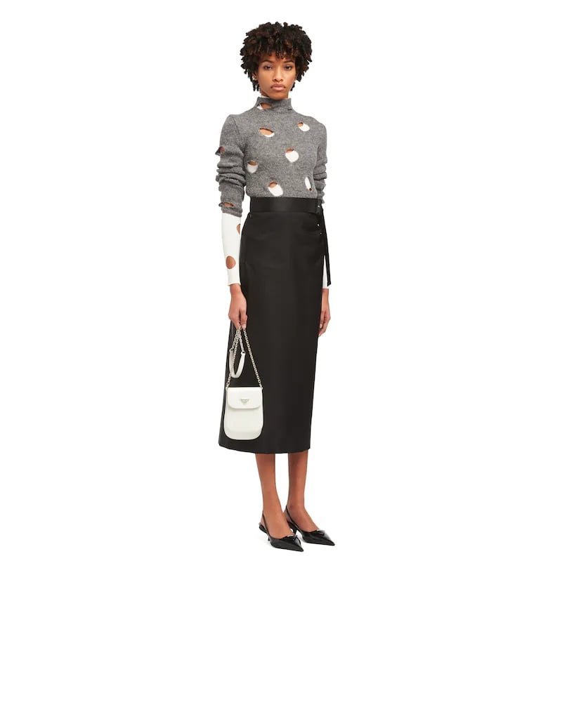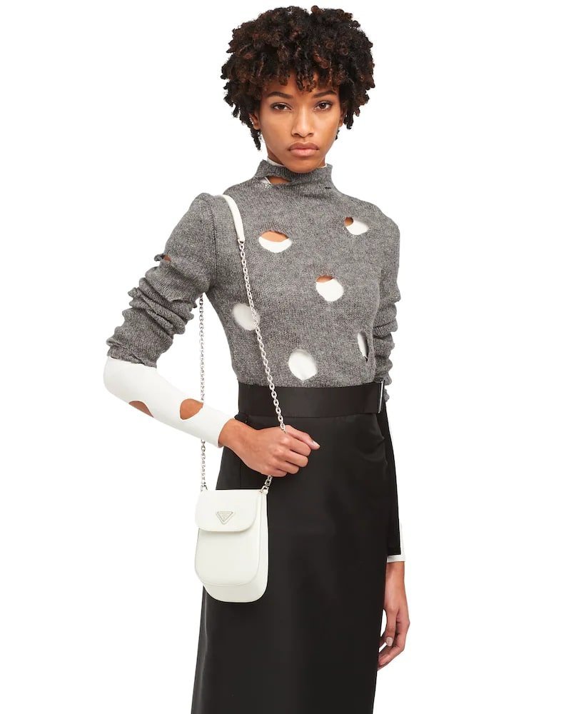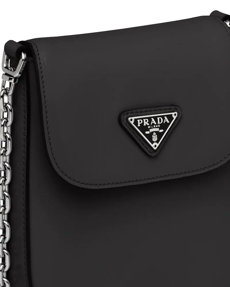 Curved, sleek lines emphasized by the particular sloping construction on the bottom and sides give this brushed leather bag a soft, light image. Brushed leather, a distinctive material of Prada collections, is a modern, chameleonic material that is perfect for always new combinations and contrasts. The enameled metal triangle logo on the flap completes the accessory.