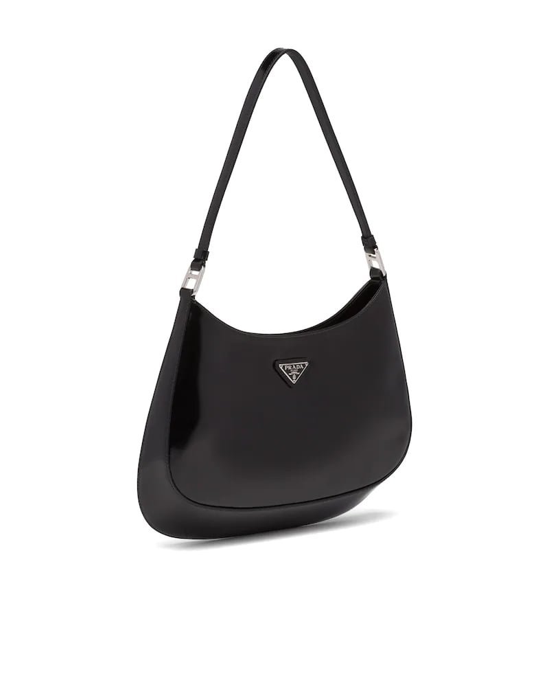 The Prada Cleo bag with sophisticated allure reinterprets an iconic design of the brand from the 1990’s. Sleek curved lines emphasized by the particular construction rounded on the bottom and sides give this hobo bag a soft, light look. Brushed leather, a modern and versatile material that is distinctive in Prada collections, is ideal for creating always new combinations and contrasts. The enamel triangle logo decorates the silhouette.