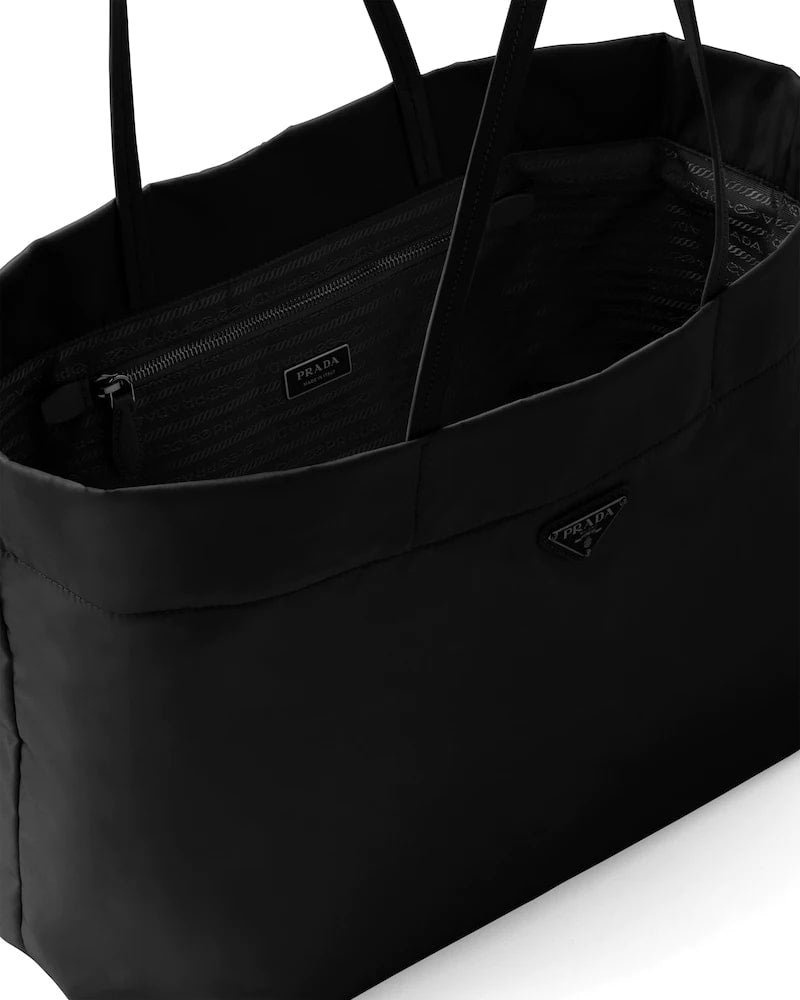 This tote bag characterized by the sleek lines of its design is made of Re-Nylon, the innovative regenerated nylon fabric by Prada produced from recycled, purified plastic trash collected in the ocean, fishing nets, and textile waste fibers. Completed with handles made of fine Saffiano leather, the bag is accented by the enameled metal triangle logo.