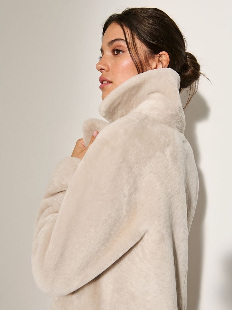 For elegant winter evenings abroad, New Year’s Eve celebrations in the city, or upscale dinners at the ski lodge, the Yvette full-length sheepskin coat puts you in the spotlight and keeps you luxuriously warm. Crafted from rich shearling sheepskin with the fur side out and a linen-printed interior, this gorgeous coat features a slit in the back for rear ventilation and easy movement. A notch collar, three pockets, and hand-sewn snap closures complete this distinguished design.