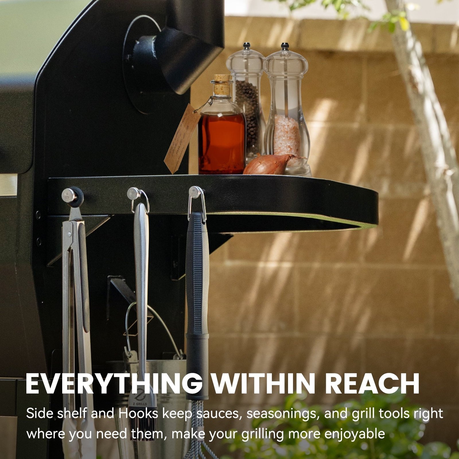 - Convenience at Your Fingertips: Designed for practicality, the grill features a foldable front shelf and side shelf, offering plenty of prep space. Keep your tools organized and within reach using the integrated tool hooks—everything you need for a seamless grilling experience.