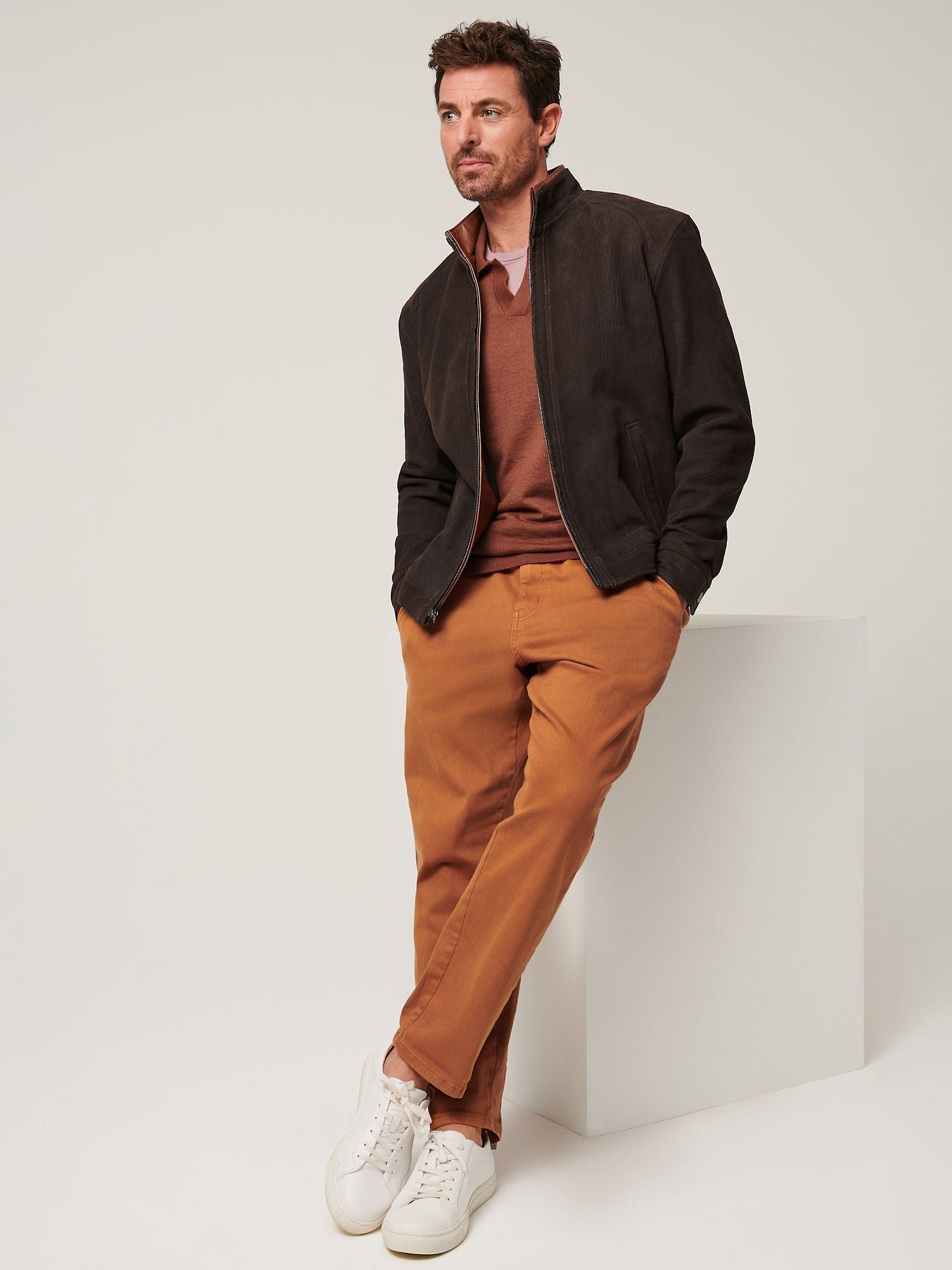 Cool yet casual—that’s the Zachary, a wear-everywhere leather jacket with a stylish standup collar. Crafted from distressed English suede lambskin, this zip-front jacket features a ruggedly handsome texture that’s soft and smooth to the touch. Loaded with pockets both inside and out, Zachary is expertly tailored with a comfortable satin lining, making it easy to slip right on, whether you’re dashing off to the big game or taking in the view from a majestic mountain top.